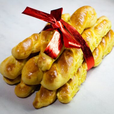 Till julen 2008 ville jag hitta på något annorlunda saffransbröd till glöggminglet och då hittade jag recept på saffransgrissini men i det recepten skulle grissinisarna ha en apelsinfyllning. Det var dock inte gott så året därpå gjorde jag grissinisarna på mitt sätt. 🙂