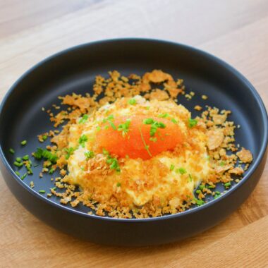Superkrämig äggröra med krispig topping och löjrom