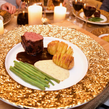 Oxfilé sous vide med hasselbackspotatis, rödvinssås, bearnaisesås och haricots verts