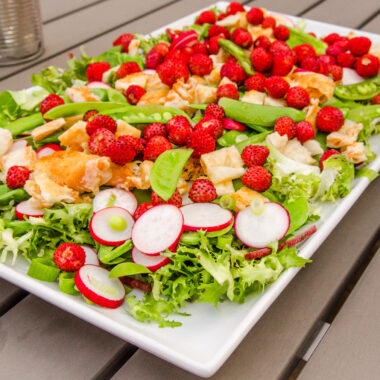 Härlig sallad som är knaprig, söt och salt på samma gång. En bättre sallad att ställa fram på midsommarafton till det grillade köttet finns inte! Är det svårt att hitta färska smultron går det lika bra med färska jordgubbar.