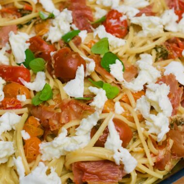 Vitlök- och örtrostad tomatcarbonara med krispig prosciutto och krämig buffelmozzarella