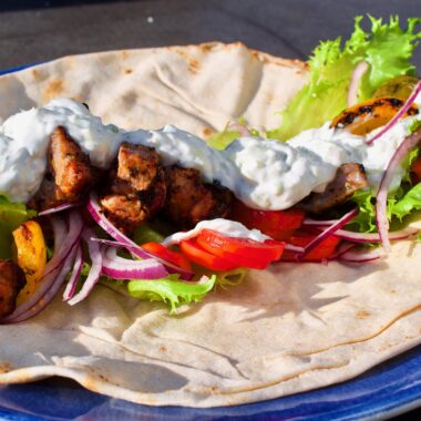 Grekisk fläsksouvlaki med lök, paprika och tzatziki