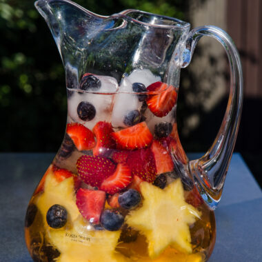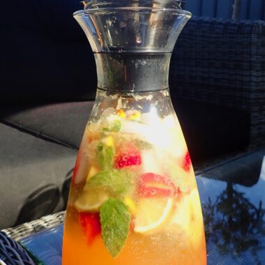 Denna midsommarafton blir det en härlig sangria som smakar otroligt mycket sommar, den är livsfarligt god och den smakar inte alls alkohol 🙂