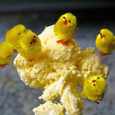 Det som verkar vara ett delat ägg är något mycket bättre, nämligen en skopa mangosorbet i Kinders chokladägg 🙂