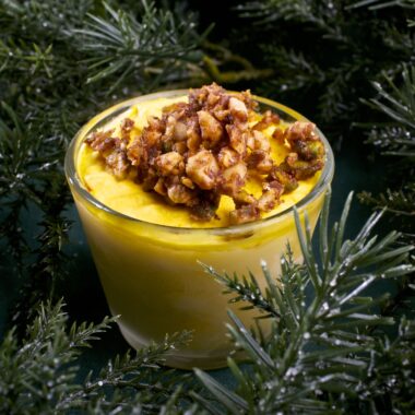 Under december månad äter jag och min man oftare efterrätt en vad vi gör vanligtvis 🙂 Denna saffransparfait är gudomligt len och har en lagom smak av saffran, servera pepparkaksnötterna till så höjer dina gäster dig till skyarna!