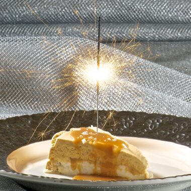 Dulce de leche -glasstårta på marängbotten toppad med salt kolasås