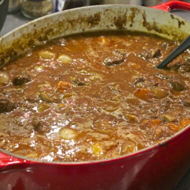 Denna gryta är en något förenklad version av Julia Childs berömda Boeuf Bourguignon och den är fantastisk god 🙂