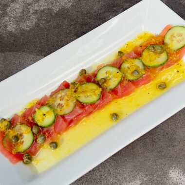 Tonfisk sashimi med en citrus- och kaprisvinaigrette