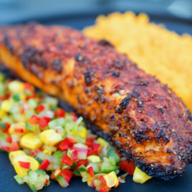Cajunsotad lax med grönsaksssalsa och sötpotatismos
