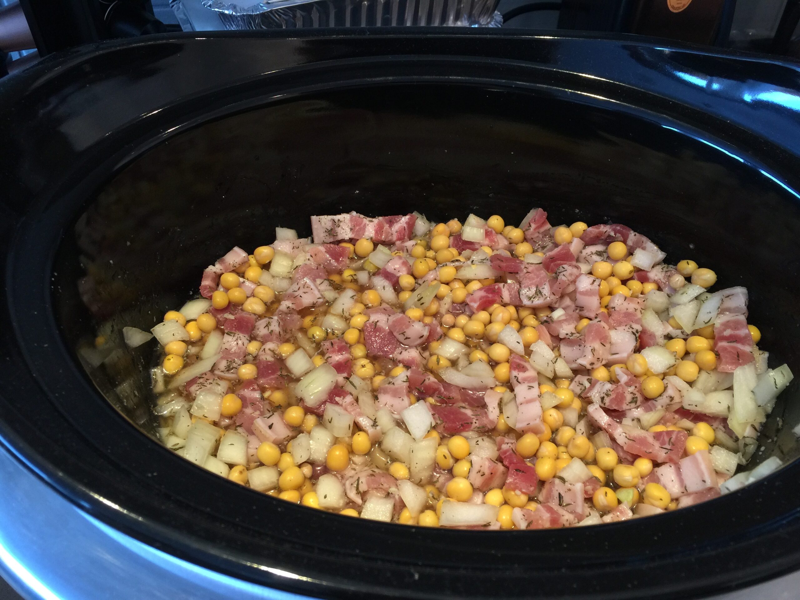 - Häll av ärterna och lägg dem i Crock Pot:en tillsammans med fläsket, löken, 7 dl vatten, buljongtärningarna samt kryddorna.