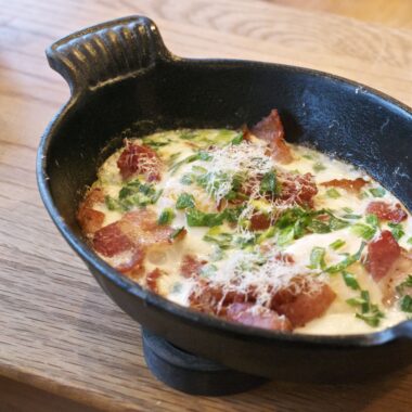 - Garnera eventuellt med lite knaperstekt bacon och servera tillsammans med några skivor baguette.