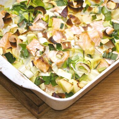 - När grytan är klar tillsätt smålökarna och champinjonerna och låter de bli varma innan du serverar grytan tillsammans med mandelpotatismos, kokt potatis eller ris.