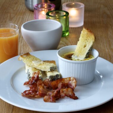 - Finhacka och knaperstek baconen, låt rinna av på hushållspapper.