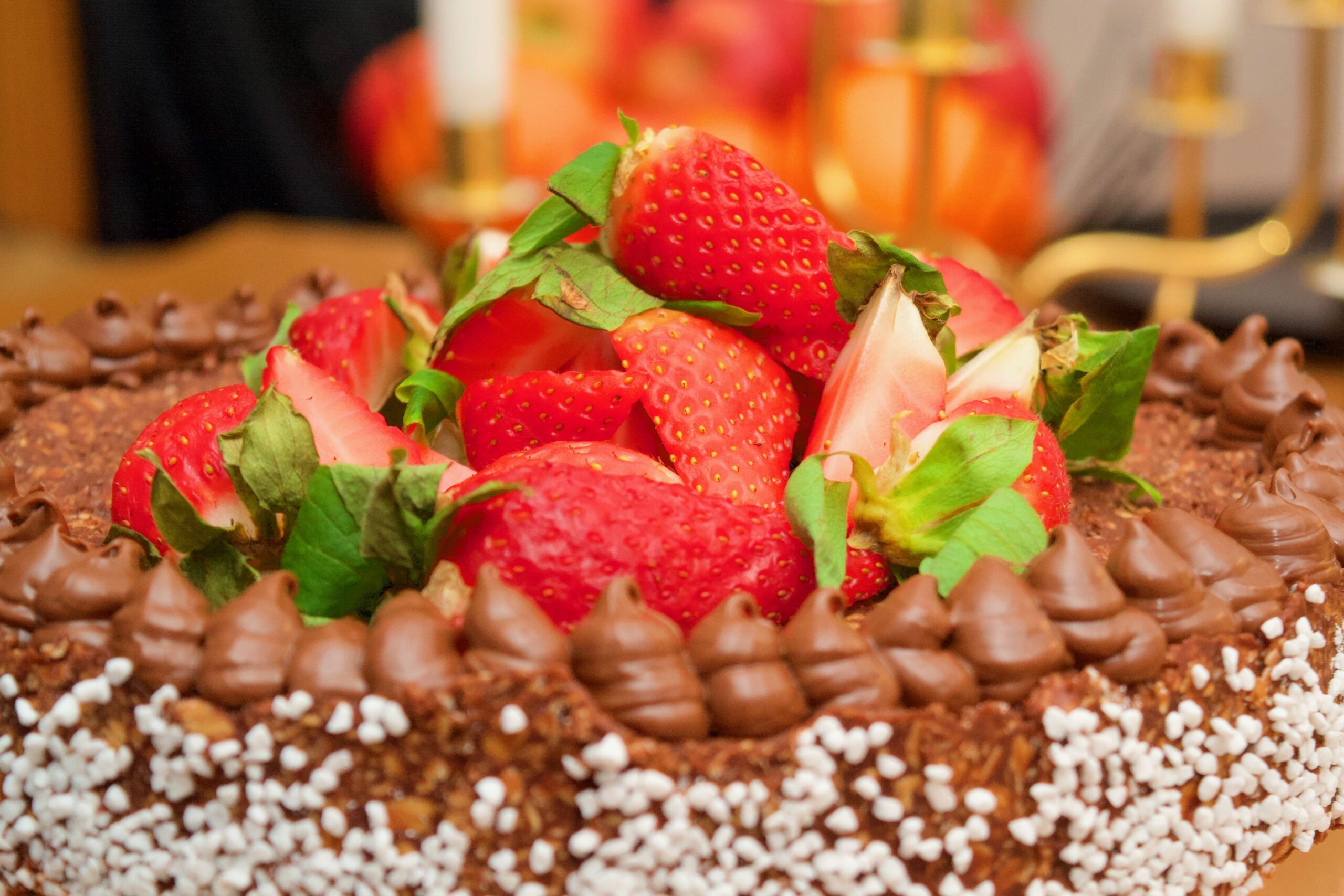- Spritsa små toppar ovanpå tårtans kan och avsluta med att lägga jordgubbar i mitten.