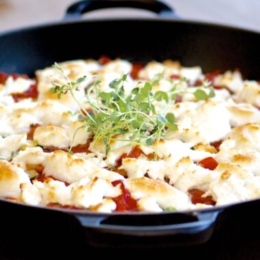 - Garnera med knaperstekt bacon och servera tillsammans med ris och ugnsrostade pärltomater med gräslök.