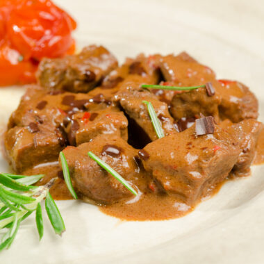 - Ta upp basilikabladen ur marinaden och fördela dem runt tartaren, ringla över lite av vinägretten och strö över några pinjenötter samt några krutonger. Avsluta med att strö över chokladspån.