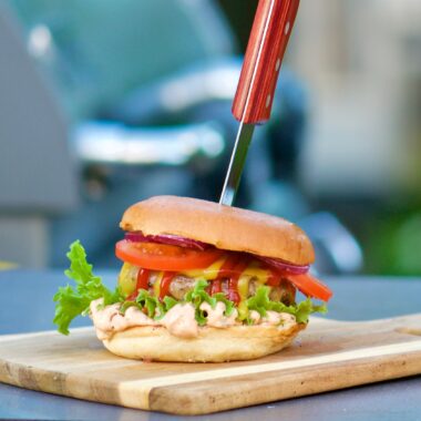 Högrevsburgare med rostad vitlöksdressing och bbq-lök