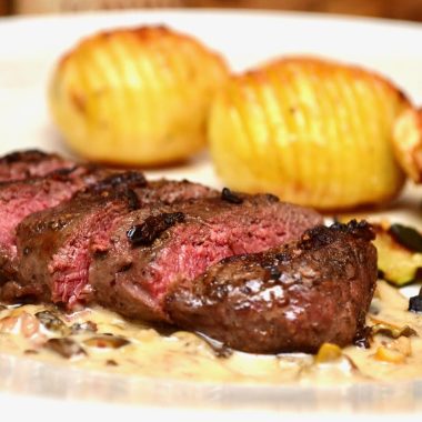 Grillad marinerad hjortfilé med hasselbackspotatis, kantarellsås och rostade grönsaker