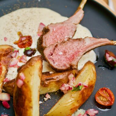 Lammracks med getostkräm, bakade cocktailtomater och oliver i rödlöksdressing