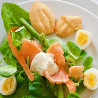 Påsksallad med gravad lax, vaktelägg och ostiga kaninöron