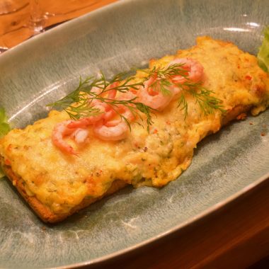 Ugnsbakad saffranslax med räk-och paprikatopping