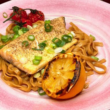 Pastagratäng med lax och basilika