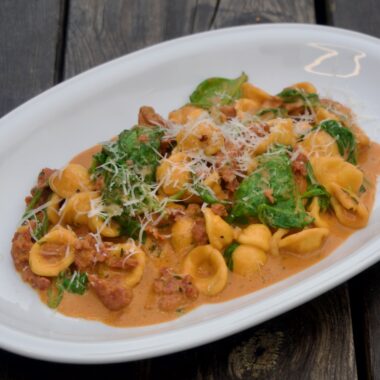 Orecchiette pasta i krämig salsicciasås med babyspenat