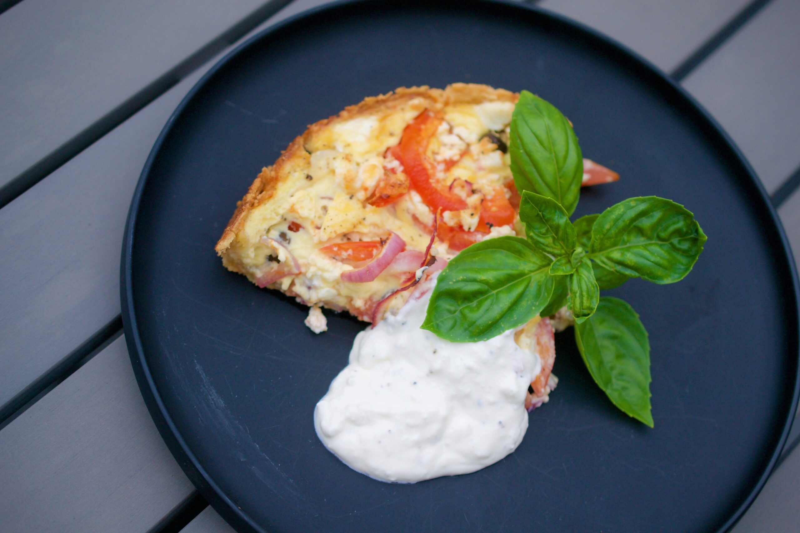 - Fördela lök- och tomatskivorna i det förgräddade pajskalet. Smula över fetaosten och lägg på olivskivorna.