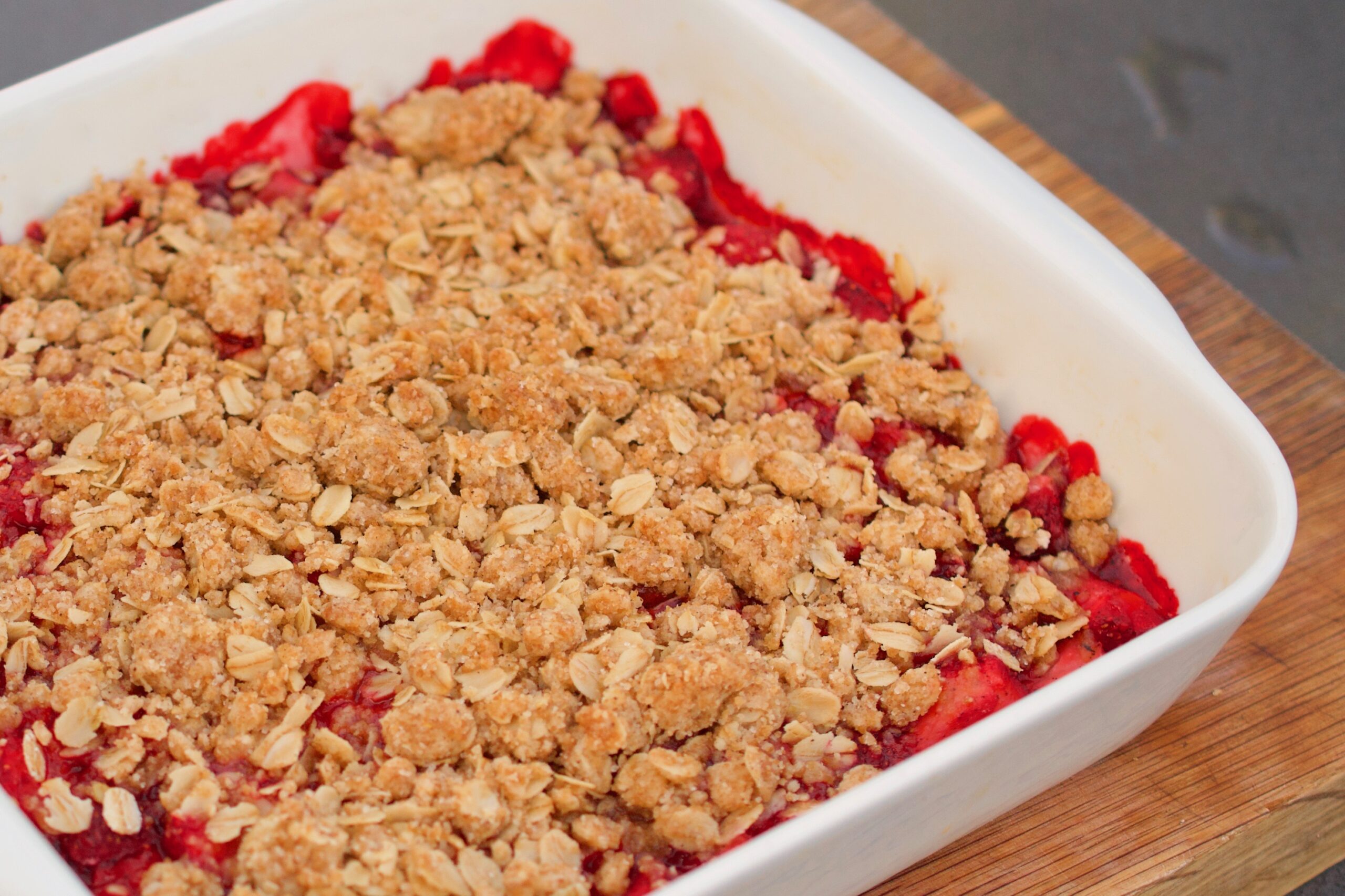 - Fördela smuldegen på jordgubbarna och ställ in pajen mitt i ugnen i 35-40 minuter eller tills jordgubbarna bubblar och smuldegen är gyllenbrun.